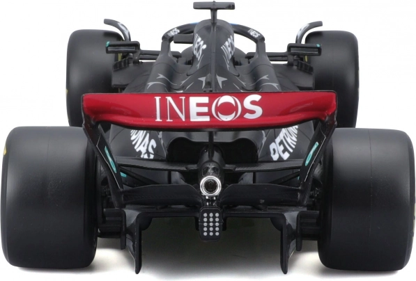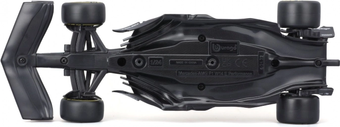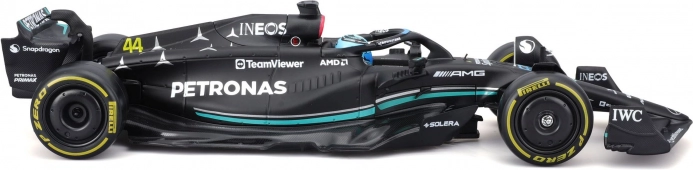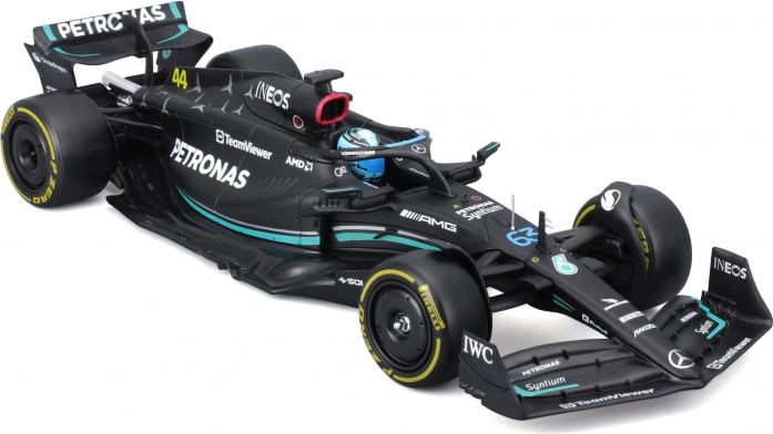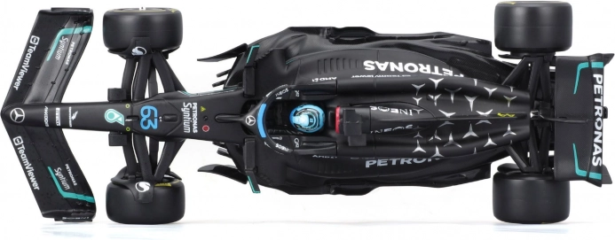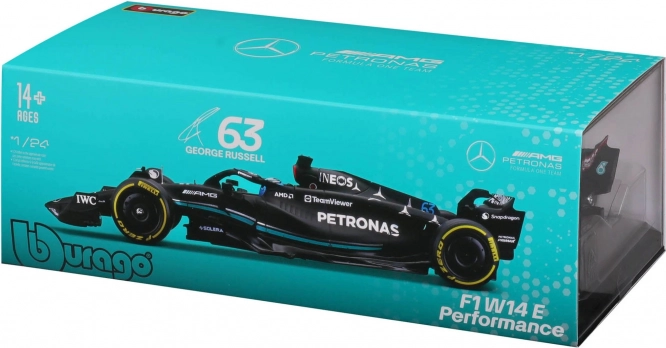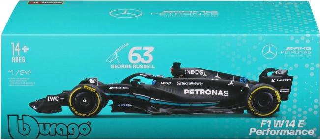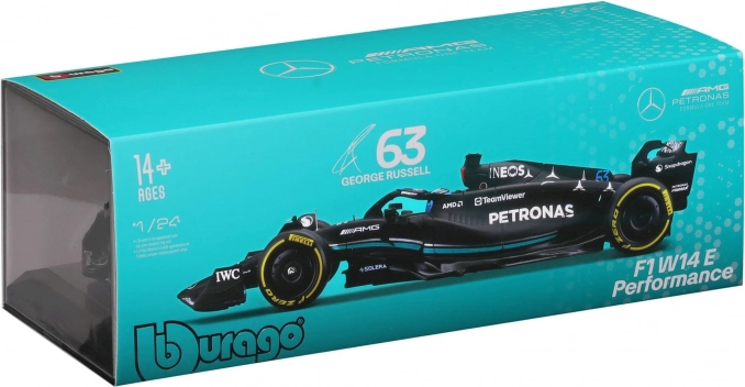 Ta uradno licencirani model MERCEDES‑AMG PETRONAS F1 W14 (2023) znamke Bburago zvesto ujame oblike, barve in detajle enosedežnika sezone 2023, vključno s startno številko 63 za Georgea Russella. Črna barva s turkiznimi poudarki, natančni tiski sponzorjev in ikonični elementi, kot sta halo in krila, še podkrepijo realističen videz.