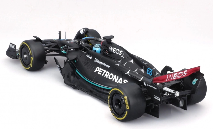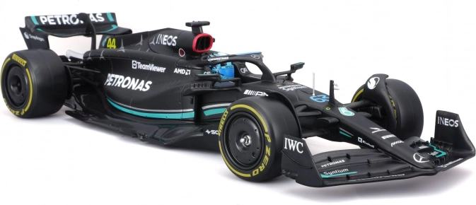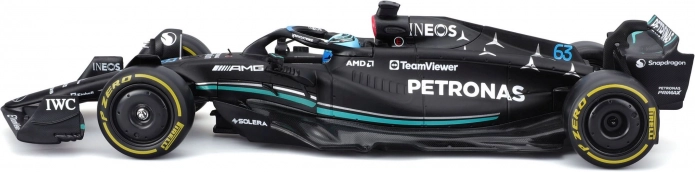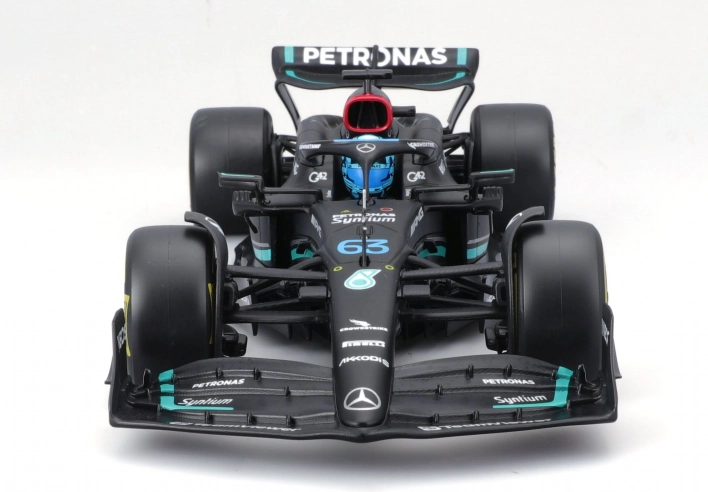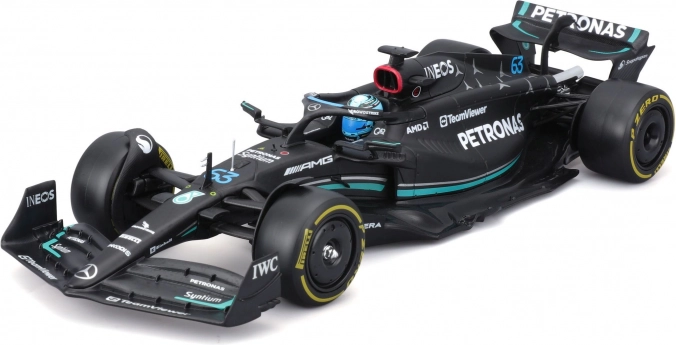 Zvesto reproducirane oblike, lak in sponzorski logotipi MERCEDES‑AMG PETRONAS F1 W14 (2023) s startno številko 63 za Georgea Russella.
