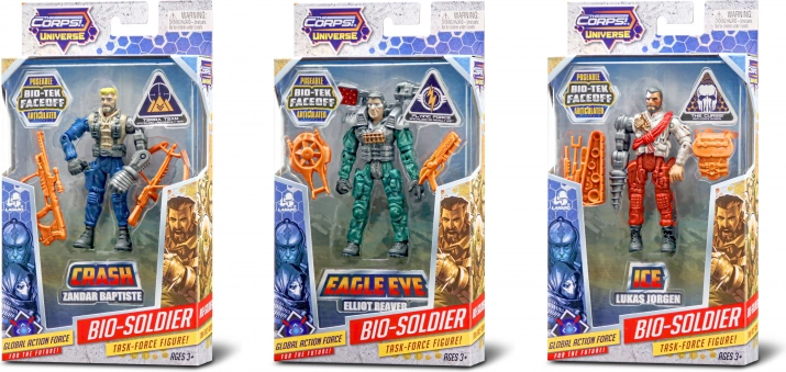Odkrijte svet poln akcije s The Corps vojakom z orožjem. Ta figurica velikosti 10 cm prihaja s tremi različnimi različicami: Crash, EagleEye in Ice. Vsaka izmed različic ponuja edinstven dizajn in osebni stil, kar otrokom omogoča, da se potopijo v različne scenarije, polne dogodivščin in strateških iger.