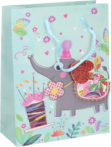 Prisrčna otroška darilna vrečka velikosti S bo razveselila vsakega malega slavljenca. Ponuja priročen format 23 × 18 × 8 cm in motive štirih priljubljenih živali: plamenec, tiger, slon in žaba. Idealna za zavijanje manjših daril, igrač in sladkarij.