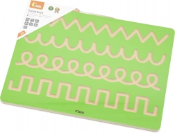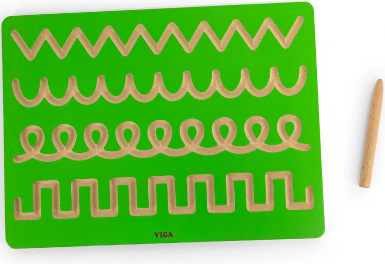 Ta kompaktna lesena tabla je zasnovana za intuitivni trening potez in smeri, ki jih otroci uporabljajo pri risanju in pisanju. S priloženim lesenim pisalom otrok sledi cikcakom, zankam in lokom, s čimer krepi pravilen prijem in tekočnost gibov.