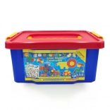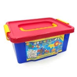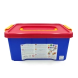 Škatla z rdečim pokrovom in modrim dnom je idealna za shranjevanje in prenašanje kock, kar pomaga ohranjati red.