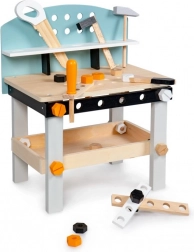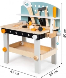 Lesena otroška delovna postaja ECOTOYS je idealna izbira za male domače mojstre od 3. leta dalje. Ta igralna miza je izdelana iz varnih materialov brez ostrih robov in vsebuje 38 elementov za kreativno igro, vključno z delovno mizo z odprtinami, organizatorjem za orodja in polico pod delovno površino.