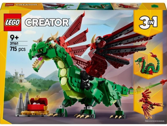 S kompletom LEGO Creator 3 v 1 Srednjeveški zmaj otroci zlahka vstopijo v svet vitezov, gradov in mitskih bitij. Glavni model prinaša podrobnega zelenega zmaja z nastavljivimi krili, vratom, čeljustjo, nogami in repom, zato ga lahko postavijo v akcijske poze. Del kompleta je tudi skrinja z zakladom za še bogatejše zgodbe.