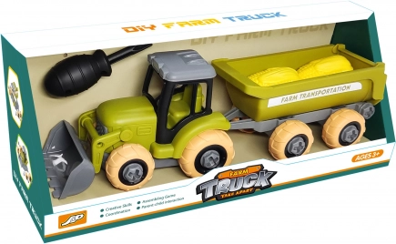 Vijačni traktor z nakladačem in prikolico, 27 cm. Razvija tehnično spretnost in kreativnost, kakovostna plastika, priložen otroški izvijač.