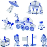 V paketu so šablone za barvanje in več kot 55 kosov pohištva in dodatkov (roboti, sateliti, tablice itd.), ki spodbujajo domišljijo in fino motoriko. Materiali s certifikatom FSC zagotavljajo odgovoren izvor papirja in kartona.