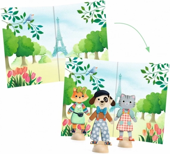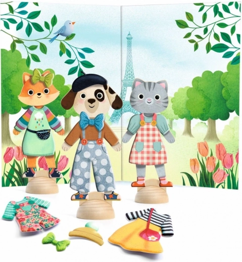 Z Djeco kolažem Bonjour Paris otroci oblačijo lesene figurice v modne oprave in ustvarjajo lastne pariške pustolovščine. Trpežni, večkrat uporabni kosi so enostavni za prijem, dobro se prilegajo in vabijo k neomejeni igri, ki spodbuja kreativnost, pripovedovanje zgodb in fino motoriko.