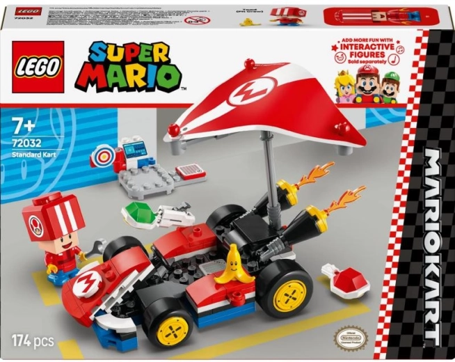 Pripravite se na dirkanje, driftanje in jadranje s setom LEGO Super Mario Mario Kart – Standardni gokart. Vključen je Toad iz boksarske ekipe, odstranljiv Super Glider, kolesa za drift in streljanje lupin v tarčo. Povežite z interaktivnimi figuricami LEGO Mario, LEGO Luigi ali LEGO Peach za zvočne in vizualne učinke ter še zabavnejšo igro.
