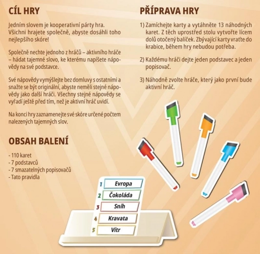 - 110 kart, 7 podstavkov, 7 izbrisljivih flomastrov, pravila igre