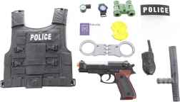 Komplet vsebuje telovnik, baterijsko pištolo, lisice, daljnogled in drugo opremo za realistično igro policistov.