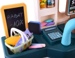 Celoten set je izdelan iz plastike v prijetnih umirjenih barvah in vključuje 71 kosov dodatkov, vključno s sadjem, zelenjavo, pekovskimi izdelki in številnimi drugimi predmeti, kar otrokom omogoča neskončno igro. Blagajna ima izvlečni predalček za denar in prenosni čitalnik kod, ki ustvarja realistične zvoke, kar naredi igro še bolj zanimivo.