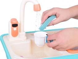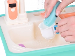 Funkcije: Dovolj je, da rezervoar napolnite z 2,2 litra vode, zavrtite pipo in opazujete, kako voda kroži. Korito lahko zamašite s priloženim zamaškom, kar otroke uči varčevanja z vodo in varovanja okolja. Pipa deluje na 2 bateriji AA (nista priloženi).