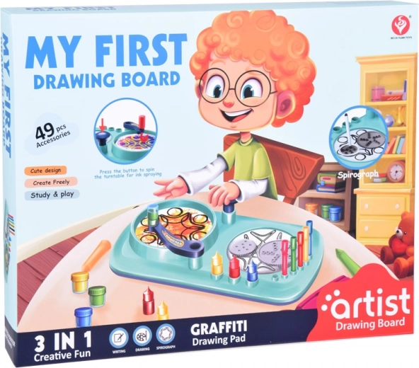Odkrijte svet ustvarjalnosti z našo interaktivno risalno tablo "My First Drawing Board". Ta edinstven set 3v1 ponuja zabavno risanje, grafite in ustvarjanje osupljivih vzorcev s pomočjo spirografa.