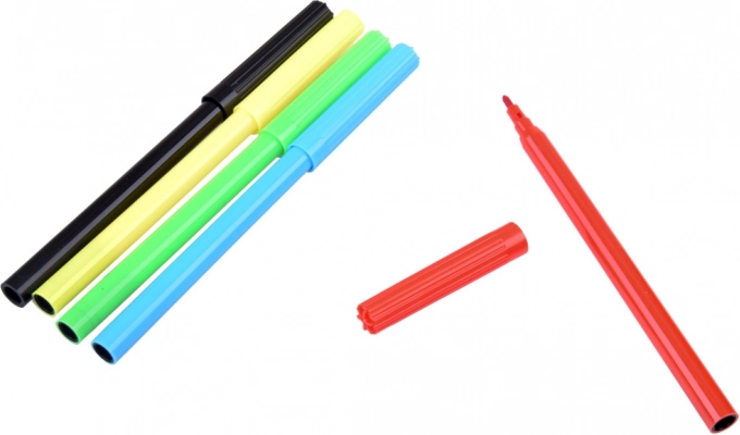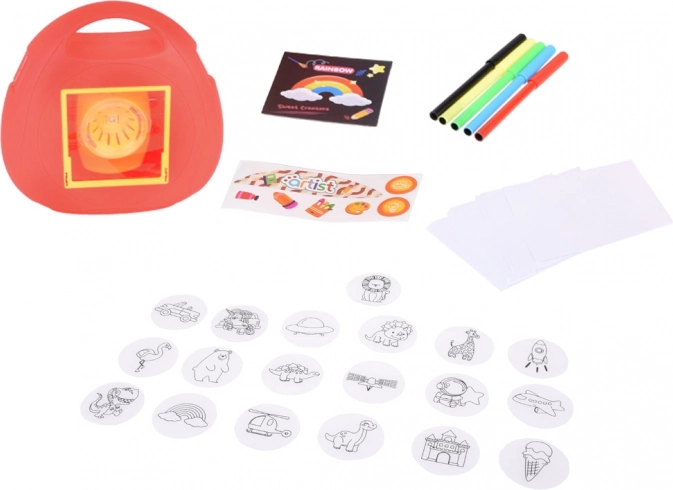 Set vključuje pet barvnih flomastrov in različne tematske diapozitive za neskončne možnosti risanja.