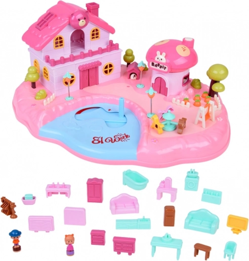 Hišica ponuja večnivojski interier s prizori za vsakodnevno igro: prijetna spalnica s posteljo, omara z vratci, kopalnica s kadjo in umivalnikom, kuhinjica s hladilnikom ter toaletna mizica. Svetlobni in zvočni učinki, ki jih sprožijo gumbi, okrepijo vzdušje igre, osvetljen napis RABBIT pa utripa v ritmu melodije.