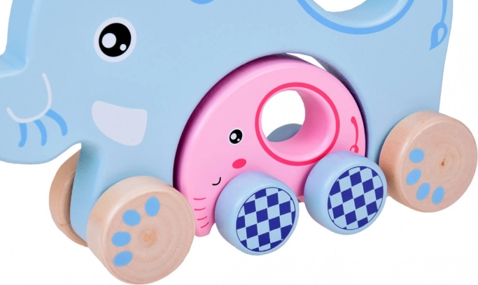 Ta leseni vlečni slon v nežnih pastelnih barvah bo razveselil vsakega otroka, ki odkriva svet hoje. Večji modri slon v sebi vozi manjši rožnati slonček, ki pri gibanju zvesto »potuje« z mamico. Igrača je gladko obdelana in prijetna na dotik, zato je odlična za male raziskovalce.