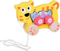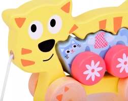 Ta lesena vlečna mačja družinica je idealen spremljevalec za prve korake. Večja muca ima v telesu odprtino za lažji prijem, pritrjeno vrvico in stabilna kolesca. Manjši mucek zvesto sledi, kar otrokom prinaša veselje do gibanja in krepi njihovo naravno radovednost.