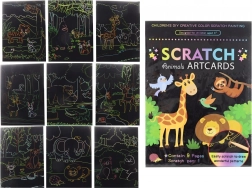 Ta komplet praskank je popolna izbira za male umetnike. Pod črno plastjo se skrivajo barvni motivi, ki jih otroci odkrijejo z postopnim praskanjem z leseno paličico. Preprosta tehnika prinaša odlične rezultate brez nereda.