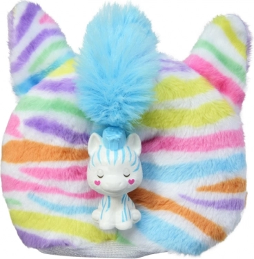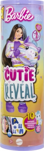 Odkrijte svet presenečenj s punčko BARBIE Cutie Reveal v kostumu mavrične zebre. Ko odstranite mehak plišast preoblečni kostum, se pokaže modna punčka z zabavnimi dodatki, dvobarvno modno jakno in videzom, ki se spreminja z vodo. Priložena sta tudi prisrčen mini ljubljenček in glavniček–gobica za čarobno razkrivanje barv.