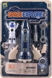 - Deli za sestavljanje (raketa / modul), figurica astronavta, plastičen izvijač, ključ