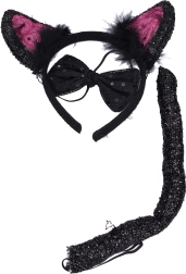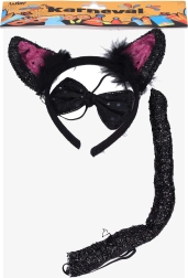 Pustni set "črna mačka" je idealna izbira za otroke, ki želijo uresničiti svoje sanje in se preleviti v elegantno mačjo junakinjo ali junaka. Set vsebuje obroč z mačjimi ušeski, metuljček in rep, kar omogoča popolno preobleko.