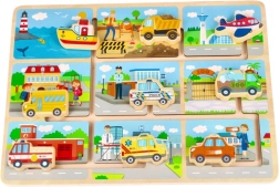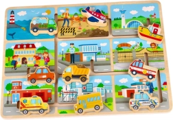 Ta barvit leseni puzzle otrokom prinaša veselje ob raziskovanju različnih prevoznih sredstev. Najdete šolski avtobus, policijski avto, rešilni avto in druga vozila, ki jih je enostavno vstaviti v ustrezne odprtine.