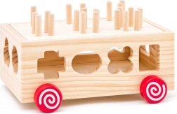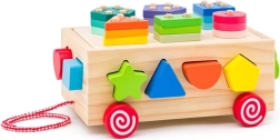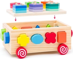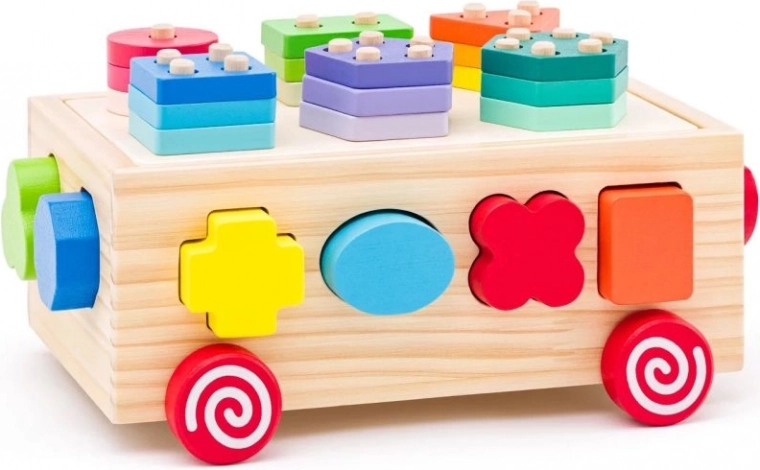 Ta leseni voziček je idealna igrača za malčke, ki združuje zabavo z učenjem. Voziček omogoča prepoznavanje oblik in razvoj fine motorike zahvaljujoč barvnim geometrijskim oblikam, ki jih otroci lahko vstavljajo v ustrezne odprtine.