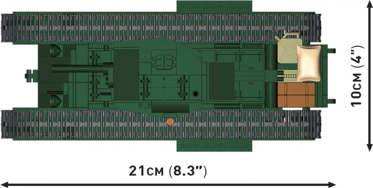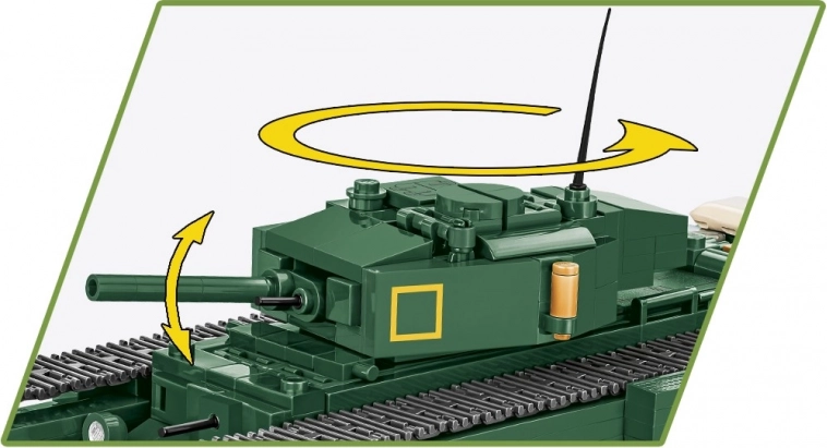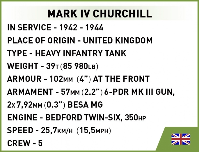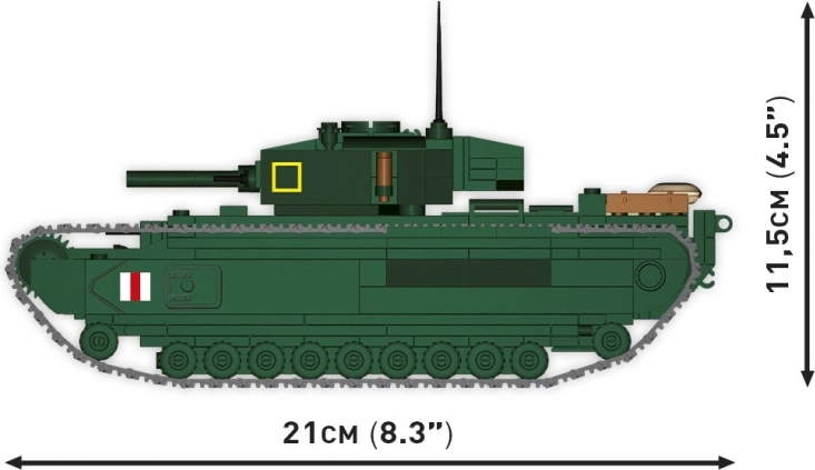 Sestavite legendarni britanski težki pehotni tank MARK IV CHURCHILL v merilu 1:35 iz 668 kakovostnih kosov COBI. Model ponuja funkcionalne gosenice, vrtljiv stolp, premični top in odpirajoč se loput. Priloženi sta 2 podrobni figurici z bogatimi dodatki ter visokokakovostni potiski, ki ne zbledijo. Idealno za ljubitelje zgodovine in gradbenih kompletov.