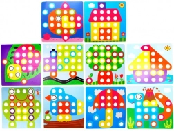 Set vsebuje slike z odprtinami, v katere se žebljički vstavljajo po barvah. Idealno za učenje barv in potrpežljivosti.