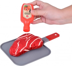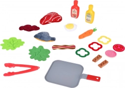 V paketu najdete praktične dodatke – ponev in klešče – ter pisan izbor živil: steak, riba, piščančji file in trakci, jajce, slanina, rezine paradižnika in čebule, listi solate, korenje, paprike ter dvojico omak (kečap in univerzalni preliv). Tako lahko otroci pripravljajo nešteto »receptov« in vadijo kuharske vloge.