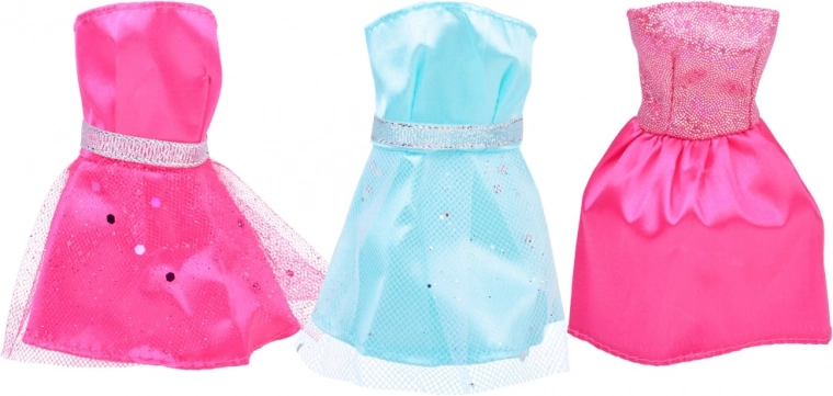 Komplet vsebuje deset različnih oblek, ki omogočajo ustvarjanje raznolikih modnih kombinacij za punčke.