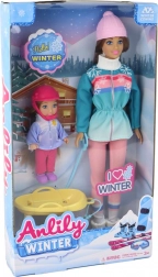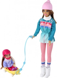 Odkrijte čar zime z mamico in hčerko na saneh. Velika punčka ima dolge rjave lase in toplo kapo, mala punčka nosi rožnato čelado za varnejšo igro. Pastelna zimska oblačila s snežinkami poudarjajo vzdušje zasneženih pustolovščin, rumene sani pa vabijo k neskončni vožnji.