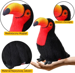 Plišasti tukan izstopa z realističnim videzom s kontrastno črno in rdečo ter značilno pisanim kljunom. Nežen material je prijeten na dotik in idealen za vsakodnevno crkljanje in mirno uspavanje.