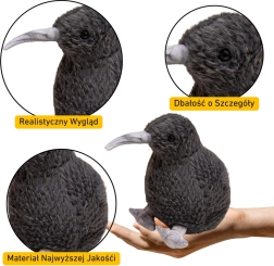 Ta plišasti kivi v elegantni črni barvi je zasnovan z izostrenim občutkom za detajle – dolg kljun, kratke noge in žametno mehak površinski material ustvarjajo verno podobo te edinstvene ptice. Zaradi kompaktne višine 17 cm se lepo prilega otroški ročici in postane priljubljen spremljevalec pri igri in spanju.
