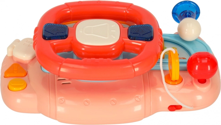 Igrača je zasnovana z mislijo na razvoj: podpira fino motoriko, koordinacijo oko–roka in senzorično zaznavanje. Praktičen pritrdilni pašček omogoča hitro pritrditev volana na voziček ali posteljico, zato se zabava lahko nadaljuje kjerkoli.