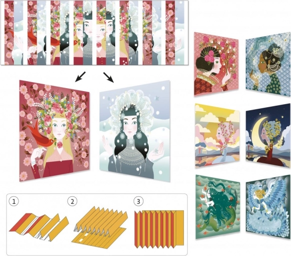 DJECO set Kinetične slike Kraljice: ustvarite 4 dekorativne slike z optičnim učinkom, dva motiva v enem. Ustvarjalna zabava za otroke od 7 let.