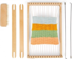 Vsebuje vse potrebne pripomočke in preje za ustvarjanje unikatnih tkanin, vključno z lesenim glavnikom, čolničkom in barvnimi niti.