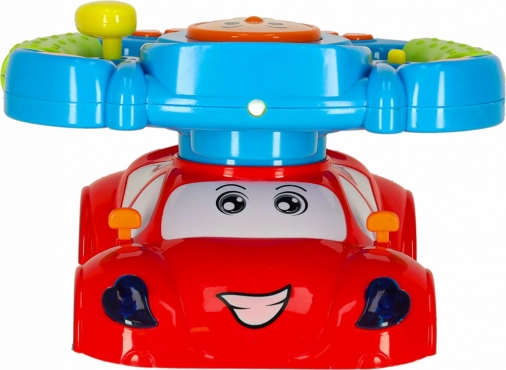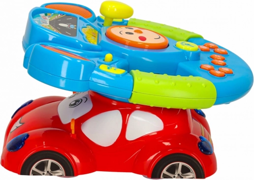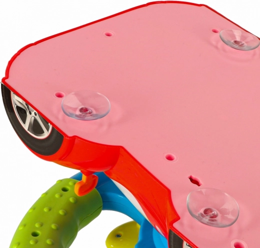 Volan je nameščen na rdečem avtomobilu s priseski na spodnji strani, kar omogoča trdno pritrjevanje na različne površine. Idealno za domačo uporabo in na poti.