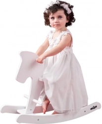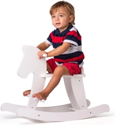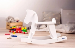 Odkrijte brezčasno klasiko za otroško sobo: bel leseni gugalni konjiček, ki združuje veselje do gibanja in podporo naravnemu razvoju. Gugalno gibanje pomaga razvijati ravnotežje, koordinacijo in grobo motoriko, medtem ko nizka višina sedeža (pribl. 28 cm) daje otrokom samozavest pri prvih vožnjah.
