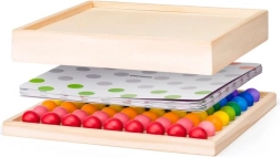 Set vključuje plasti kartic z barvnimi pikami, ki ustrezajo barvam kroglic. Otroci po njih zlahka sestavljajo slike ter urijo natančnost in zbranost.