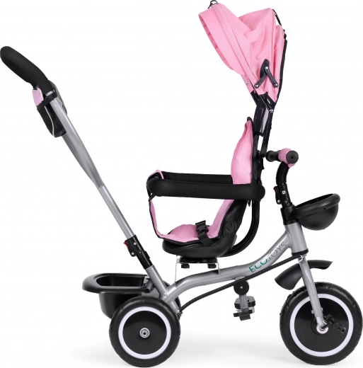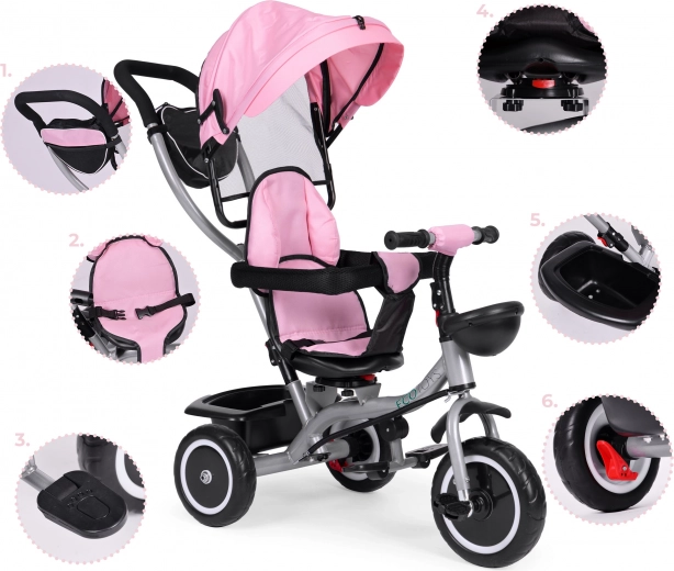 Ta multifunkcijski tricikel združuje udobje vozička in veselje prvih voženj. Zaradi vrtljivega sedeža se lahko otrok vozi obrnjen proti staršu ali v smeri vožnje. Zložljiva strešica ščiti pred soncem, vetrom in rahlim dežjem, starševski vodilni ročaj pa zagotavlja popoln nadzor nad smerjo.