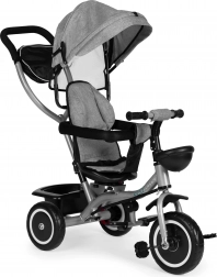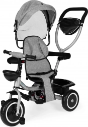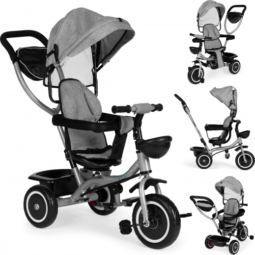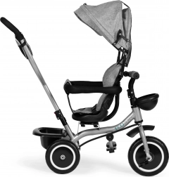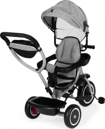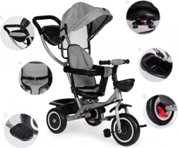 Tricikel ECOTOYS raste z vašim otrokom – od prvih voženj s starševskim vodenjem do samostojnega poganjanja s pedali. Vrtljiv sedež omogoča vožnjo obrnjeno k staršu ali v smeri vožnje, zložljiva strešica ščiti pred soncem in vetrom, 5-točkovni pasovi z zaščitno prečko pa poskrbijo za varnost na vsakršni podlagi.
