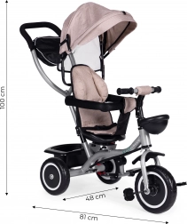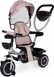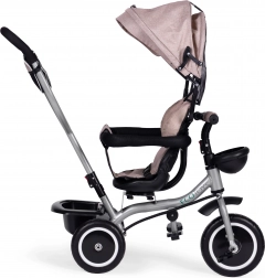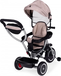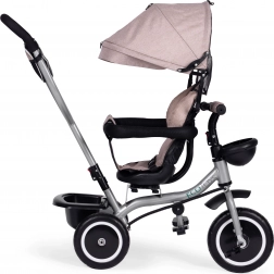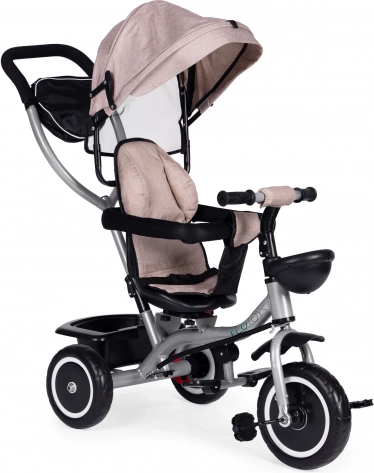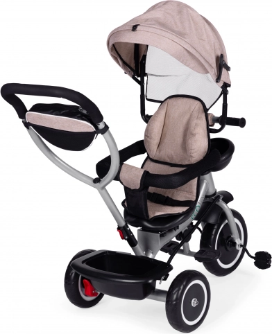Tricikel ECOTOYS združuje voziček in poganjalec v enem. Zahvaljujoč vrtljivemu sedežu lahko otroka vozite obrnjeno proti staršu ali v smeri vožnje. Starševski ročaj je povezan s krmilom, zato imate smer popolnoma pod nadzorom, medtem ko otrok počiva na zložljivih stopalkah.