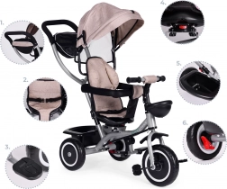 Praktična oprema vključuje zadnji koš, sprednjo košarico za igračo in žep z zadrgo za telefon ali ključe. Z postopnim odstranjevanjem strešice, loka in ročaja se tricikel prilagodi rastočim spretnostim otroka vse do samostojne vožnje.