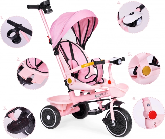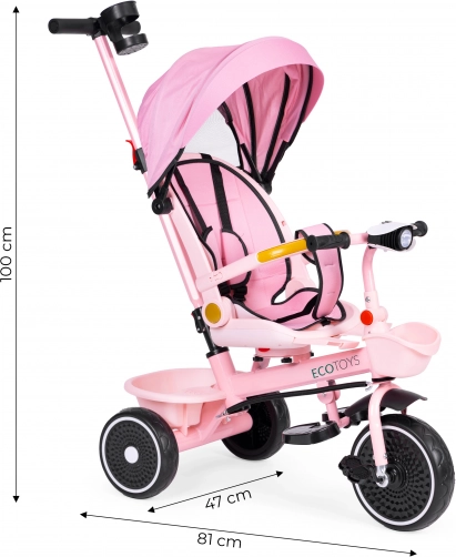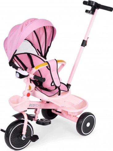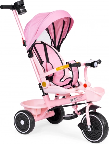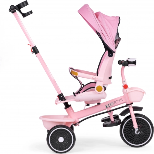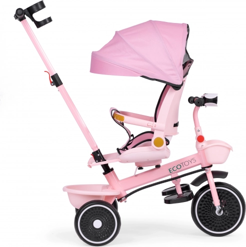 Otroški tricikel 2v1 z vrtljivim sedežem in zložljivo strešico, roza ECOTOYS