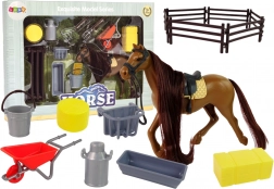 Voziček, vedro, krtača, seno, grable, vile, posode za hrano in pijačo ter ograja – vse za realistično hlevsko igro.