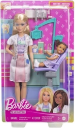 Igrajte se zobozdravnico z Barbie in njenim pacientom. Set vključuje bel plašč, zobozdravniške pripomočke in zobozdravniški stol.