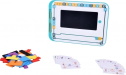 Komplet vključuje pisane lesene kocke, ki jih je mogoče poljubno sestavljati na zadnji strani tablice ali kjer koli drugje.