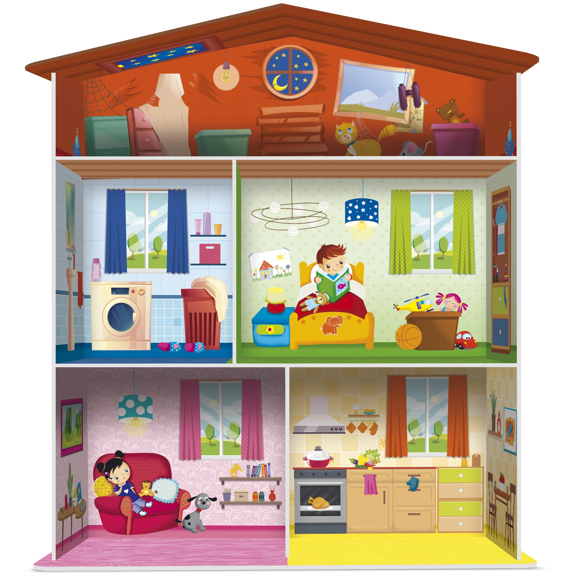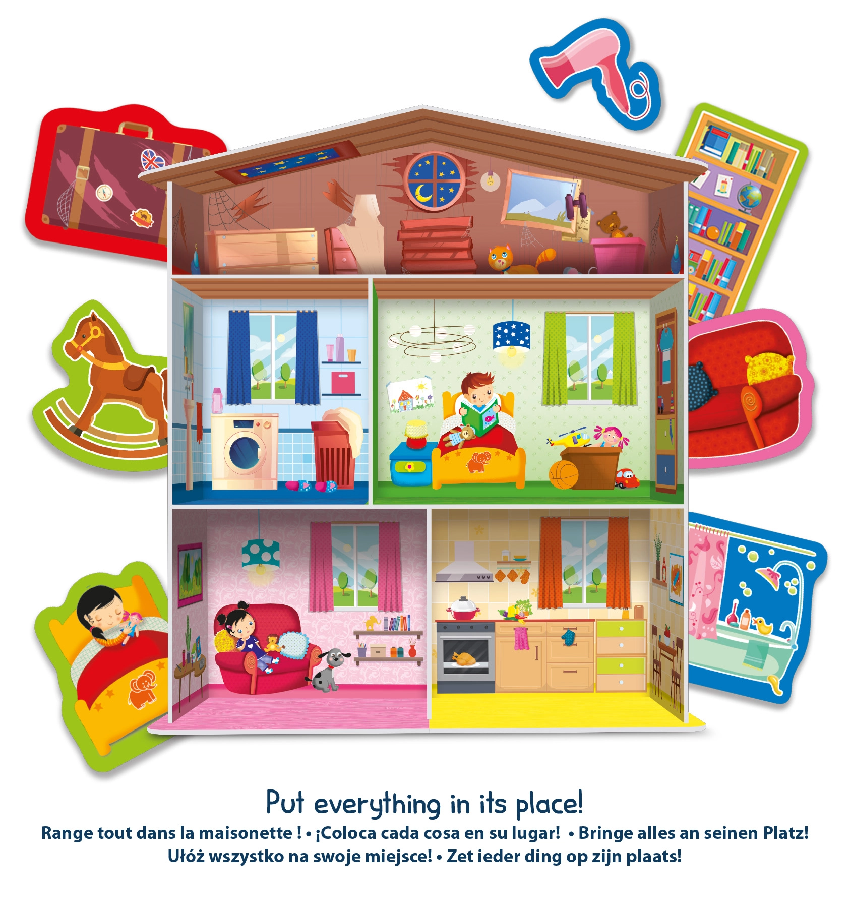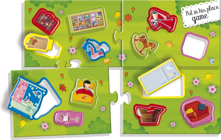 Del seta so hišica, sestavljanke v obliki domače opreme in 15 stojal za kartice, s katerimi lahko elemente pregledno razstavite ali jih uporabite za različne igralne scenarije. Odlična izbira za otroke od 3 let, ki se učijo razvrščati, poimenovati in ustvarjati lastne zgodbe.