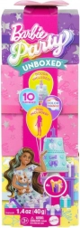 Odkrijte, kdo se skriva v notranjosti! Ta različica vsebuje brineto BARBIE s turkiznimi prameni v laseh, bleščečo obleko z vijoličnimi zvezdami in ujemajoče se vijolične čevlje. Komplet vključuje tudi prisrčnega corgija z rutico – častnega gosta vsake rojstnodnevne zabave.